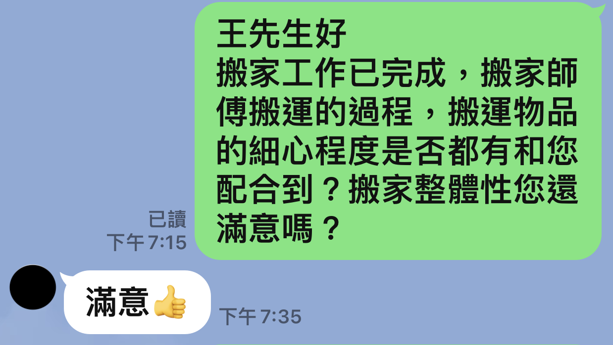 - 客戶評價:您好,很滿意這次的服務,家具都完好而且師父們搬運過程也很細心,之後搬家還會再使用貴公司的服務,感謝您