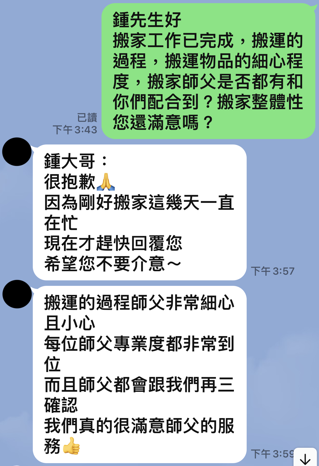- 客戶評價:很抱歉,因為剛好搬家這幾天一直在忙,現在才趕快回覆您,希望您不要介意。搬運的過程師父非常細心且小心,每位師父專業度都非常到位,而且師父都會跟我們再三確認,我們真的很滿意師父的服務。再麻煩鍾大哥幫我們跟每位師父說聲道謝,我們真的很感謝他們的幫忙。也謝謝鍾大哥經營了這麼好的搬家公司