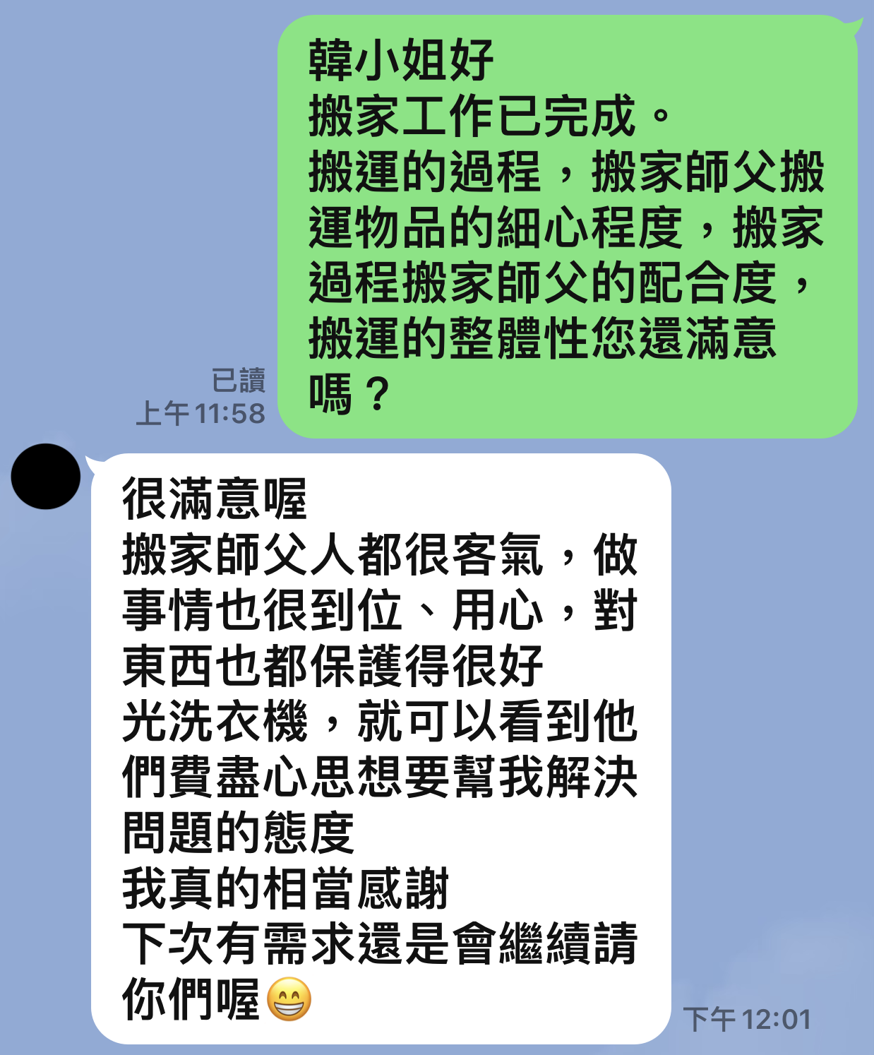 - 客戶評價:有的,師傅提前到達,也相當客氣。搬運過程仔細不潦草,感謝您們
